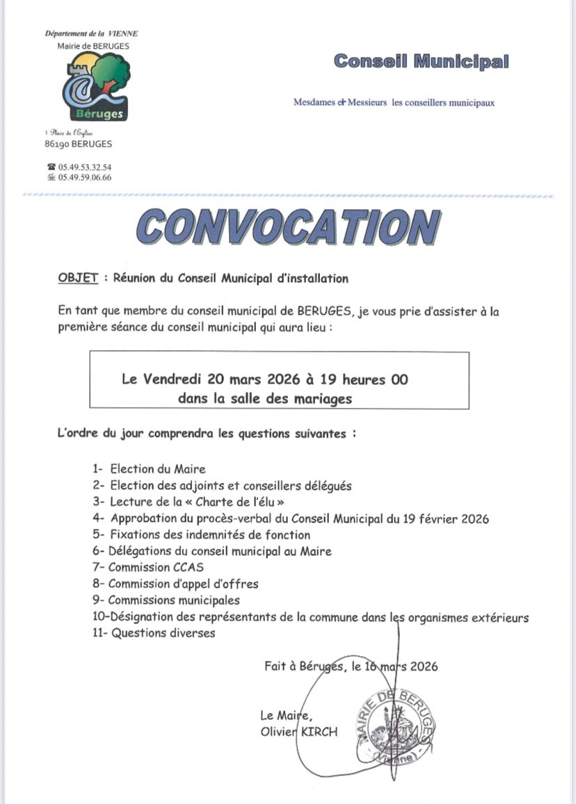 vendredi 20 mars à 19h salle des mariages Ordre du jour Election du Maire Election des adjoints et conseillers délégués Lecture de la 'Charte de l'élu' Approbation du PV di Conseil Municipal du 19 février Fixations des indemnités de fonction Délégations du conseil municipal au Maire Commission CCAS Commission d'appel d'offres Commissions municpales Désignation des […]