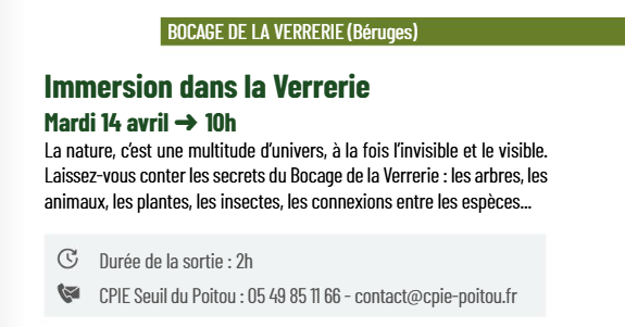 Mardi 14 avril, sortie découverte de l'ENS de la Verrerie de 10h à 12h. La sortie est gratuite et familiale. Cette sortie est financée par le conseil départemental. Entre pâturages et bocages se cachent de nombreuses espèces, arriverez-vous à les observer et à les identifier ? A partir de 5 ans Inscription : Découverte de l'ENS de Béruges […]